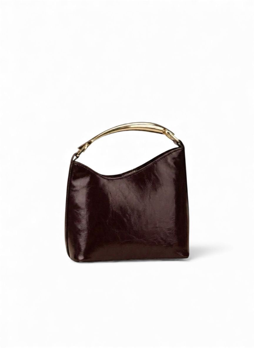 • Statement Hardware: Defined by a striking, architectural gold-tone metal handle that curves over the top.
